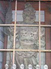 不動明王(ふどうみょうおう)・・・インドの「アジャラナータ」というシヴァ神の異名が訳され「不動」という名になった。なった。また、大日如来(密教の最高仏)が、一切の魔を降伏させるため怒りの形相で現れた姿が不動明王だとされ、その炎は迦楼羅炎(かるらえん)と呼ばれあらゆる魔を焼き尽くすと言われる。修験道(しゅげんどう)で、最も尊崇されるのはこの明王である。