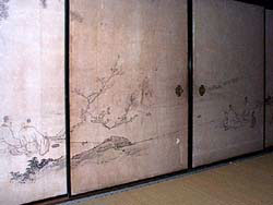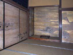 大通寺内に、「含山軒」という茶室があります。主客はその含山軒へ通され、従者は、「蘭亭」という間で控えます。 庭園は、東方にそびえる伊吹山を借景とするところから「含山軒」の名が生まれました。国の名勝に指定されています。 「含山軒」の一の間には、狩野山楽筆の山水画が、二の間には、狩野山雪筆の山水画が描かれています。 「蘭亭」には、「曲水宴図」があります。この襖絵(ふすまえ)は、円山応挙筆です。中国の有名な書家・王義之の書いた「蘭亭集序文」の中に「曲水」という文言があり、襖絵は、その「曲水の宴」の物語が描かれているそうです。 この「含山軒」も「蘭亭」も、共に 建物は重要文化財に指定されています。 |