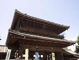 大通寺は真宗大谷派の別院で、長浜御坊(ごぼう)と呼ばれています。 湖北と福井県敦賀郡を教区とする真宗門徒の中心寺院で、天正年間(1573〜1592)、湖北地方の信者が寄合道場をつくり、会所とか総坊と呼んだのが大通寺のはじまりだとされています。 開基は真宗大谷派初代教如上人と伝えており、慶長7年(1602)東本願寺が建立されると、湖北3郡の末寺はこの総坊を大通寺と呼ぶようになり、、承応元年(1652)長浜城跡から現在地に移りました。 本堂は、東本願寺にあった伏見城の遺構を移したものといわれ、阿弥陀如来をまつるところから、阿弥陀堂とも呼ばれ、桃山時代の建築です。 広間の玄関は宝暦10年(1760)当住、横超院の内室であった数姫(彦根藩主井伊直惟の息女)によって祖師聖人500年忌に増築されたものです。広間の内部の帳台構等の部分には極彩色の狩野派の花鳥図、花卉(かき)図、人物図などが描かれ、その金具にはこの建物が建てられた桃山時代特有の五三の桐と唐草文様をあしらっています。 本堂前にあって南面する山門は文化5年(1808)に起工され32年間かけてようやく完成した堂々たる二層門です。 塀つづきにある脇門(台所門)は、二層門ができるまで山門に使われていましたが、元長浜城の大手門であり、その門扉には、本能寺の変のとき明智側に属した京極氏が攻撃した当時の矢や銃弾の痕(あと)が残っています。 その他、客室や庭園、屏風、襖絵など貴重な文化財を多数保有しています。 |