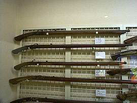 国友町は、安土桃山時代から江戸末期にかけて、およそ300年もの間、鉄砲の製造で栄えた街です。言い伝えによると、美濃(みの)の国から刀剣工がやってきたとも、浅井分鍛冶部’(かじべ)の子孫がやって来て住んだところとも言われています。 日本に鉄砲が伝来したのは天文12年(1543)ですが、その翌年には早くも、室町将軍足利義晴の命令で、鉄砲(六匁玉)2挺を献上し、「能当」の銘(めい)を授かったのが国友鉄砲の始まりです。 元亀元年(1570)の姉川の合戦では、織田信長が鉄砲を武器として使いました。信長は、その後、天文18年(1549)には、500挺もの鉄砲を注文しました。また、長篠の戦い(1575)では、3500挺の鉄砲で武田方を圧倒しました。こうして、国友は、鉄砲の一大産地として栄えることになりました。最盛期には、70軒あまりの鍛冶屋と500人をこす職人がいたと言われています。 その後、長浜城主となった秀吉の配下に置かれ、江戸時代には、幕府の御用鉄砲師として召し抱えられました。 しかし、江戸時代、太平の世になると鉄砲の発注は大変減りました。そこで、国友では、鉄砲で磨いた技術を生かして、金工彫刻や花火などの平和な産業を興しました。 |
