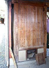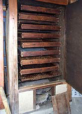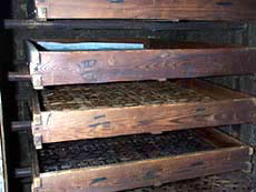 生きたマユのまま糸を繰(く)るのが最良ですが、多くのマユを短時間に処理(しょり)できないので、放っておくと羽化(うか:サナギからガになる)してしまいます。そこで、半生乾燥(はんなまかんそう:「むしころし」ともいう)して、低温室で保管(ほかん)します。 江戸時代そのままの土室で木炭を使って蒸(む)し焼きします。 マユの乾燥状態(かんそうじょうたい)は、品質に大きく影響(えいきょう)します。そのため、殺蛹の温度や時間は各家の秘伝(ひでん)でした。この工場では、ツバキの葉をマユの上にいっしょに置いて、その葉の乾燥の状態で判断(はんだん)されるとのことでした。 |