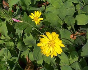 タンポポと間違えやすい。茎は長く細くて地面をはい、たくさんのへら形の葉がつく。