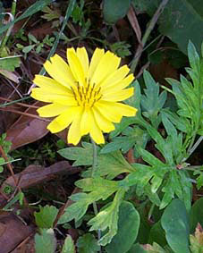 タンポポと間違えやすい。茎は長く細くて地面をはい、たくさんのへら形の葉がつく。