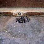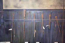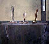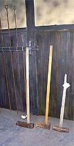 仕事場は、道具類が使いやすいように整理されています。中央にはフイゴがおかれ、壁には銃身を作るシノ、はさむためのハシ、鉄を鍛える槌