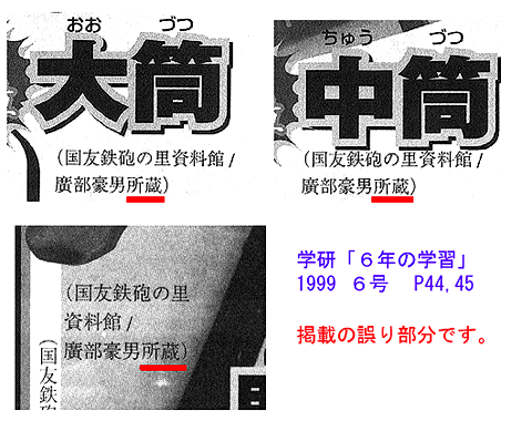 P45,P46の「速攻先制買い この火縄銃がほしい!!!!」に掲載されています本資料館所蔵の鉄砲について誤った記載がされています。 大筒、中筒、馬上筒の所蔵者が、廣部豪男と書かれていますが、写真提供者の誤りです。各鉄砲の本当の所蔵者は、「鉄砲の里資料館」や国友町内の方々です。(1999/06/01) 学研「6年の学習」8月号のP137に訂正文を載せていただけました。(1999/07/26) (Web管理者:廣部豪男) |
